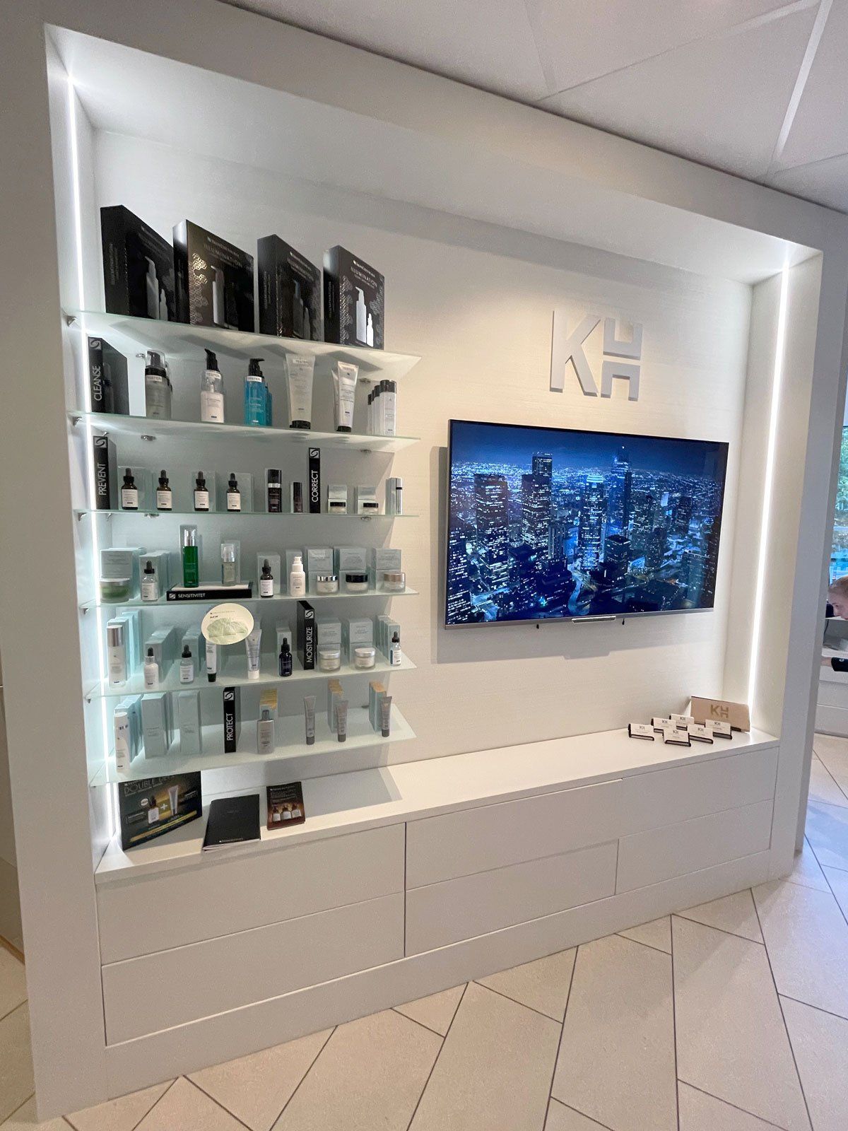 Nye møbler, teppe, farger og spesialdesign av eksponeringsreoler/hyller for kosmetikk.